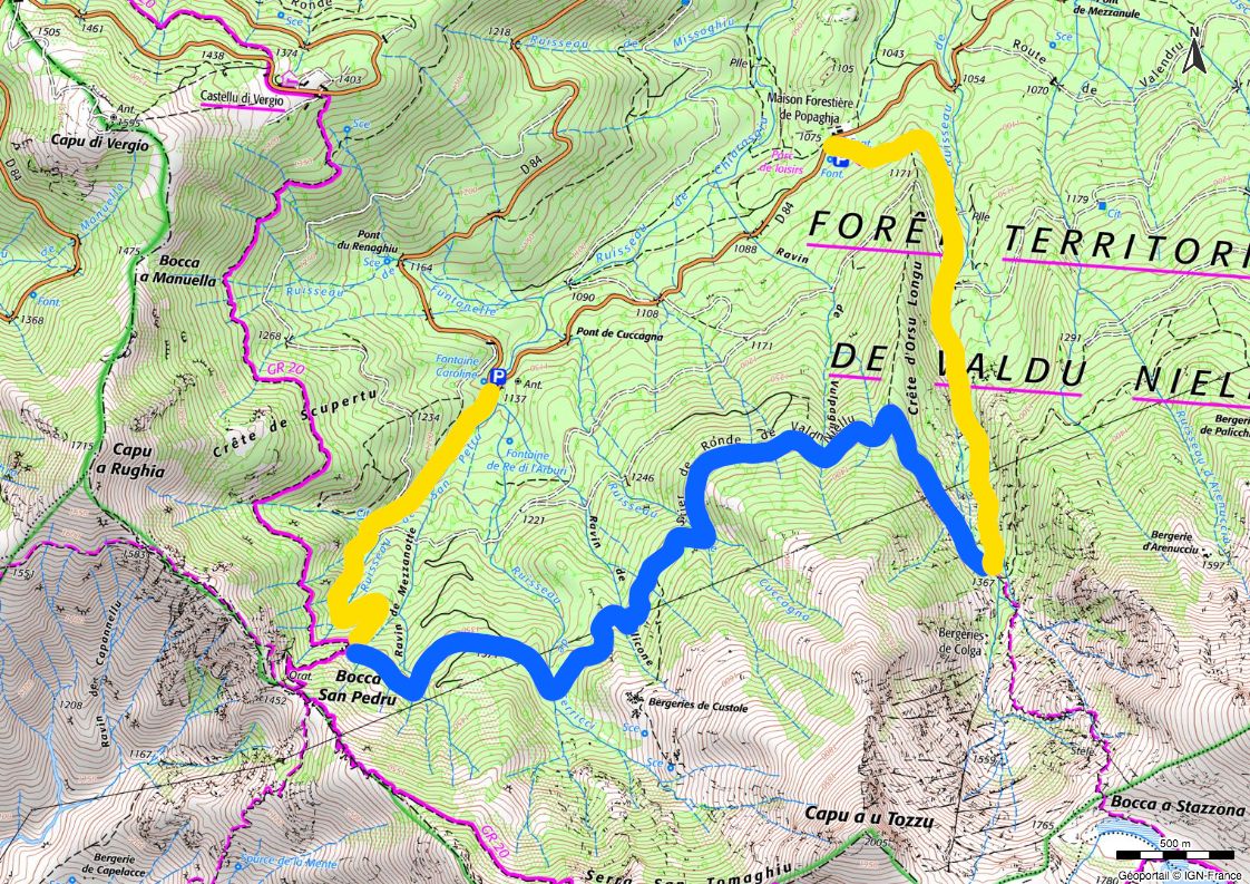 Departure : The Caroline fountain, following the yellow markers until you reach the fork, then the blue markers up to the Colga sheepfold, finally taking the yellow signposted route to reach the Maison Forestière.