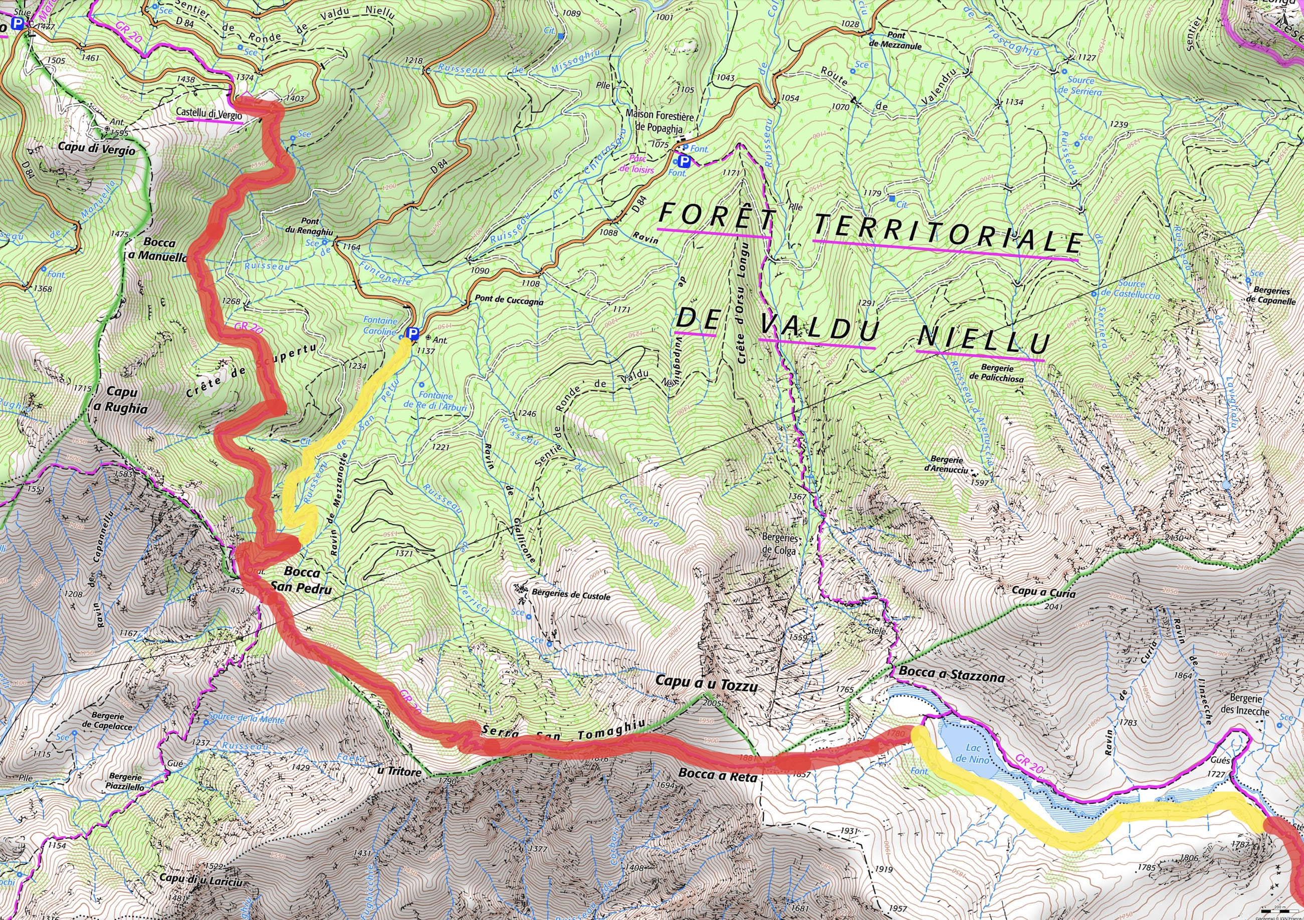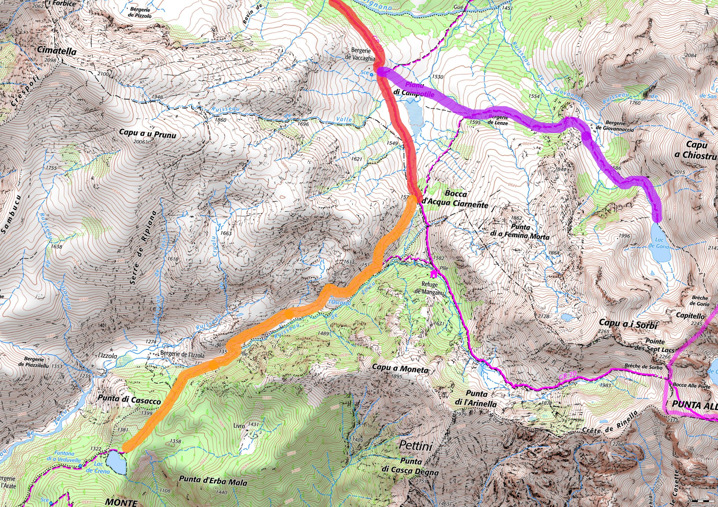 Old shepherd huts of Tilerga, yellow trail markers, then join the GR 20 with red and white trail markers.